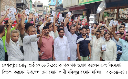 জানাগেছে, ৬ষ্ঠ উপজেলা পরিষদ নির্বাচন আগামী ৮ মে অনুষ্ঠিত হবে। ২৩ এপ্রিল সকালে যশোর জেলা নির্বাচন অফিসের প্রার্থীদের প্রতীক বরাদ্দ প্রদান করা হয়। ঘোড়া প্রতীক পেয়ে ২৩ এপ্রিল বিকাল ৫টায় কেশবপুর বাজারে ব্যাপক গণসংযোগ ও লিফলেট বিতরণকালে উপজেলা চেয়ারম্যান প্রার্থী মফিজুর রহমান মফিজের সাথে উপস্থিত ছিলেন উপজেলা আওয়ামী লীগের কোষাধক্ষ স্বপন কুমার মুখার্জী, সহ-দপ্তর সম্পাদক মনোজ তরফদার, যুব ও ক্রীড়া বিষয়ক সম্পাদক এস এম মহব্বত আলী, কার্যনির্বাহী কমিটির সদস্য আলতাফ হোসেন বিশ^াস, আব্দুস সাত্তার খান, উপজেলা জাতীয় শ্রমিক লীগের আহ্বায়ক সরদার মুনছুর আলী, উপজেলা যুবলীগের আহ্বায়ক বি এম শহিদুজ্জামান শহিদ, কেশবপুর সদর ইউনিয়ন আওয়ামী লীগের সাধারণ সম্পাদক কবির হোসেন, পৌর আওয়ামী লীগের সাংগঠনিক সম্পাদক মিজানুর রহমান, যুব ও ক্রীড়া বিষয়ক সম্পাদক আবুল কালাম আজাদ, পৌর সভার ৫ নং ওয়ার্ড আওয়ামী লীগের সভাপতি জালাল উদ্দীন মোল্যা, কেশবপুর সদর ইউনিয়নের ৩নং ওয়ার্ড আওয়ামী লীগের সভাপতি নিমাই চন্দ্র দাস, ৪নং ওয়ার্ড আওয়ামী লীগের সভাপতি মাসুদুজ্জামান, কেশবপুর সদর ইউনিয়ন যুবলীগের আহ্বায়ক তৌহিদুর রহমান, যুগ্ম-আহ্বায়ক আব্দুল গফুর গাজী, যুগ্ম-আহ্বায়ক মেহেদী হাসান শিমুল, মঙ্গলকোট ইউনিয়ন যুবলীগের আহ্বায়ক আল আলাল দিলু, যুগ্ম-আহ্বায়ক টিপু সুলতান, বিদ্যানন্দকাটি ইউনিয়ন যুবলীগের যুগ্ম-আহ্বায়ক ফারুক হোসেন, উপজেলা মৎস্যজীবি লীগের সাংগঠনিক সম্পাদক মোস্তাক আহম্মেদ প্রমুখ।