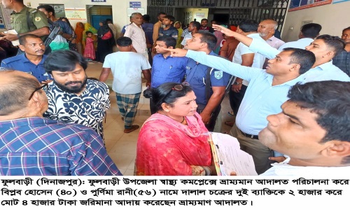 দিনাজপুরের ফুলবাড়ী উপজেলা স্বাস্থ্য কমপ্লেক্সে ভ্রাম্যমান আদালত পরিচালনা করে বিপ্লব হোসেন (৪০) ও পুর্ণিমা রানী (৫৬) নামে দালাল চক্রের দুই সদস্যকে ২ হাজার করে মোট ৪ হাজার টাকা জরিমানা আদায় করেছেন ভ্রাম্যমাণ আদালত।