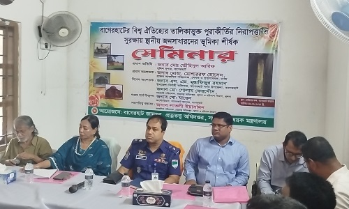 বিশ্ব ঐতিহ্যের অন্তর্ভুক্ত বাগেরহাটের পুরাকীর্তির নিরাপত্তা ও সুরক্ষায় স্থানীয় জনসাধারণের ভূমিকা শীর্ষক সেমিনার অনুষ্ঠিত হয়েছে। রোববার বাগেরহাট জাদুঘরের সভাকক্ষে অনুষ্ঠিত সেমিনারে সভাপতিত্ব করেন প্রত্নতত্ত্ব অধিদপ্তরের খুলনা ও বরিশাল বিভাগীয় কার্যালয়ের আঞ্চলিক পরিচালক লাভলী ইয়াসমিন।প্রধান অতিথি ছিলেন বাগেরহাটের পুলিশ সুপার মো. তৌহিদুল আরিফ।