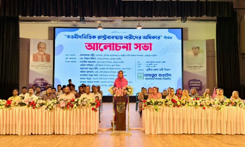প্রধান অতিথির বক্তব্যে তিনি বলেন, “বর্তমানে একদিকে ধর্মের বিকৃত ব্যাখ্যা দিয়ে নারীদেরকে ঘরবন্দি করা হচ্ছে, আরেকদিকে পশ্চিমা ভোগবাদী জীবনদর্শনের প্রভাবে নারীদেরকে পণ্য বানানো হচ্ছে। অথচ চৌদ্দশ বছর আগে ইসলাম নারীদেরকে উপহার দিয়েছিল একটি ভারসাম্যপূর্ণ ব্যবস্থা। রসুল (সা.) নারীদেরকে সমাজের প্রতিটি কাজে অংশ নেয়ার সুযোগ যেমন দিয়েছিলেন, পাশাপাশি  তাদের  অধিকার এবং সম্মানও নিশ্চিত করেছিলেন।”