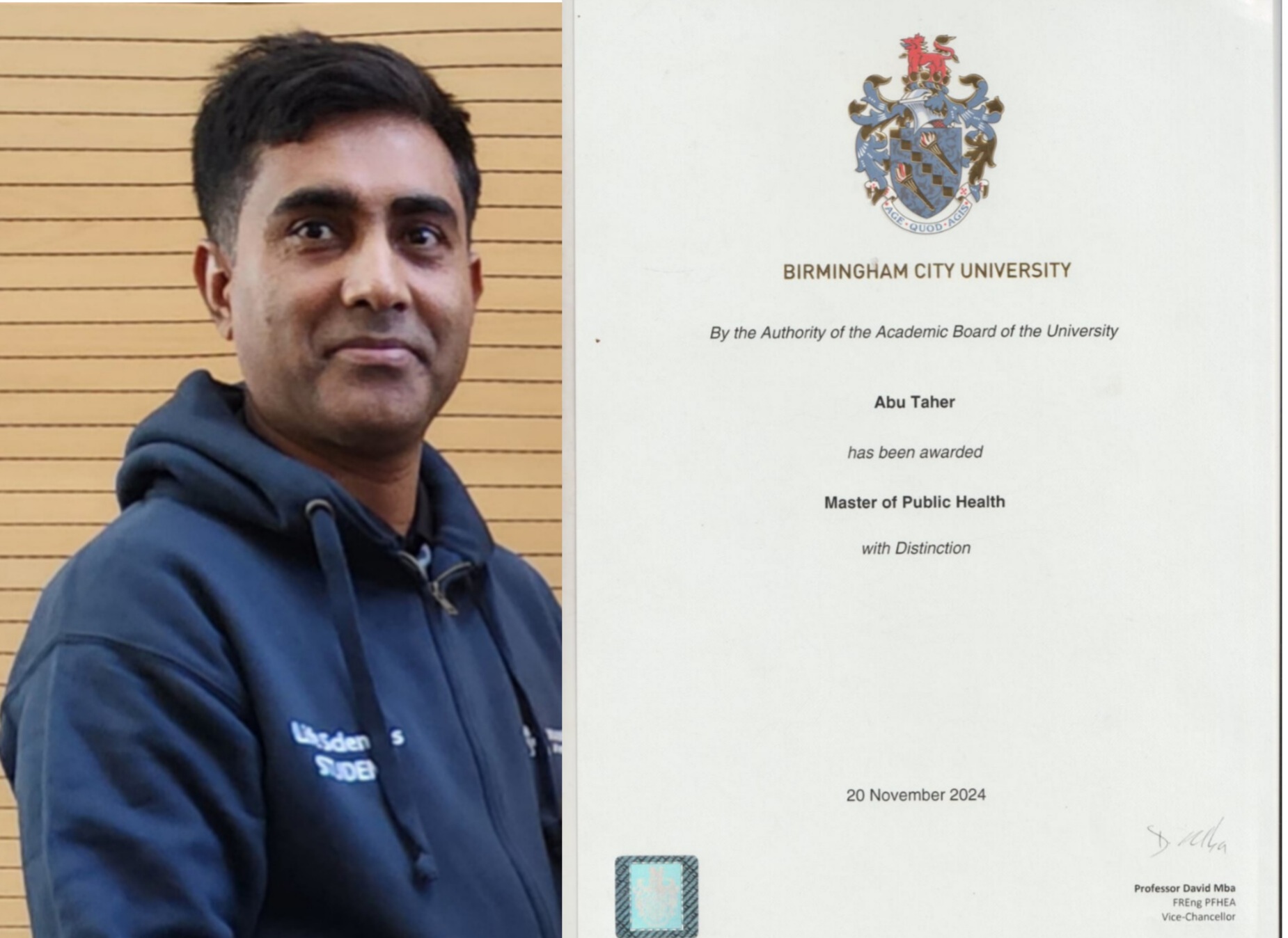 যুক্তরাজ্যের বার্মিংহাম সিটি ইউনিভার্সিটি থেকে জনস্বাস্থ্যের উপর সর্বোচ্চ পদক অর্জন করেন বাংলাদেশী চিকিৎসক ডাঃ আবু তাহের। তিনি Master of public health with distinction পদ অর্জন করেন । সম্প্রতি যুক্তরাজ্যের বার্মিংহাম সিটি ইউনিভার্সিটির স্বাস্থ্য, শিক্ষা এবং জীবন বিজ্ঞান অনুষদের প্রধান প্রফেসর ড. সেলিম খান ডাঃ আবু তাহেরের হাতে জনস্বাস্থ্যের মাস্টার পদক অর্জনের সনদ প্রদান করেন। ৩৩তম বিসিএস ক্যাডার ডাঃ আবু তাহের একই বিষয়ে ইতিপূর্বে ড্যাফেডিল ইন্টারন্যাশনাল ইউনিভার্সিটি থেকে সমমানের ফলাফল অর্জন করেন। ২০০৮ সালে সিলেট এমএজি ওসমানী মেডিকেল কলেজ থেকে এমবিবিএস সম্পন্ন করেন । ২০২১ সালে ইন্ডিয়ার মেডভার্সিটি থেকে ডায়াবেটিস ফেলোশিপ, ২০২৩ সালে অস্ট্রেলিয়ার মেলবোর্ন কলেজ থেকে পিজিডিএইচআরএম ডিগ্রি এবং মার্কিন যুক্তরাষ্ট্রের আঞ্চলিক স্বীকৃত বিশ্ববিদ্যালয় থেকে এন্ডোক্রিনোজিতে এমএসসি করেন। বিসিএস হেলথ ক্যাডার এসোসিয়েশন ফেনী জেলা শাখার সভাপতি ডাঃ আবু তাহের বর্তমানে ছাগলনাইয়া উপজেলা স্বাস্থ্য ও পরিবার পরিকল্পনা কর্মকর্তার দায়িত্বে রয়েছেন। বাংলাদেশের স্বাস্থ্য ব্যবস্থাপনায় ভূমিকা রাখতে তিনি সকলের দোয়া প্রত্যাশা করেন।