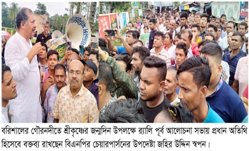 শ্রীকৃষ্ণের জন্মদিন উপলক্ষ্যে বরিশালের গৌরনদীতে স্থানীয় সনাতন ধর্মাবলম্বীদের আয়োজনে আলোচনা সভা ও র্যালি অনুষ্ঠিত হয়েছে। এ সময় প্রধান অতিথি হিসেবে উপস্থিত ছিলেন বিএনপির চেয়ারপার্সন বেগম খালেদা জিয়ার উপদেষ্টা ও বরিশাল-১ আসনের সাবেক সংসদ সদস্য এম. জহির উদ্দিন স্বপন।