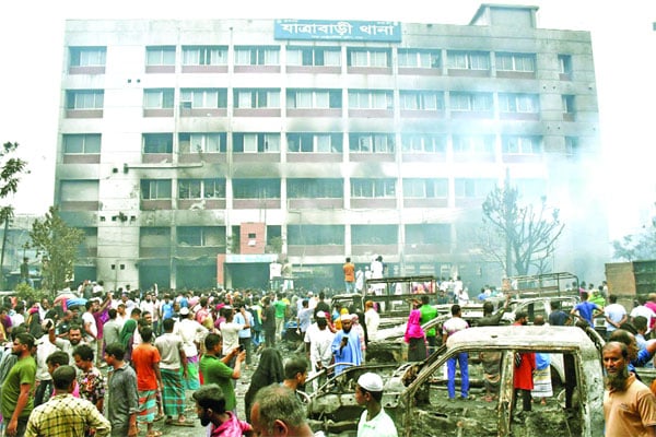 সাভারে পুলিশসহ নিহত ৩৪ : সাভারে পুলিশের নির্বিচার গুলিতে ২৮ জনের মৃত্যু হয়েছে। এ ছাড়া পিটিয়ে ও আগুনে পুড়িয়ে হত্যার শিকার হয়েছেন পুলিশ সদস্যসহ ছয়জন। গুলিবিদ্ধ হয়ে আহত হয়েছেন সাংবাদিকসহ কয়েক শতাধিক। তবে নিহত পুলিশ সদস্যদের পরিচয় নিশ্চিত হওয়া যায়নি। বিক্ষিপ্ত জনতা পুড়িয়ে দিয়েছে আশুলিয়া, ধামরাই ও সাভার মডেল থানা। আওয়ামী লীগের নেতাদের বাড়ি, অফিস ও বাণিজ্য কেন্দ্রগুলো আগুনে পুড়িয়ে দেওয়া হয়েছে। চারদিকে এখন শুধু উদ্বেগ, আতঙ্ক আর উৎকণ্ঠা। আইনশৃঙ্খলা পরিস্থিতি নিয়ন্ত্রণের বাইরে। এখনো বিভিন্ন হাসপাতাল ও রাস্তায় পড়ে আছে অজ্ঞাতনামা অনেকের লাশ। বিভিন্ন হাসপাতাল সূত্রে জানা গেছে, সাভারের এনাম মেডিকেলে গুলিবিদ্ধ হয়ে ১৪, নারী ও শিশু হাসপাতালে ৩, গণস্বাস্থ্য সমাজভিত্তিক মেডিকেল কলেজে ৯ ও হাবিব ক্লিনিকে দুজনসহ মোট ২৮ জনের মৃত্যু হয়েছে। এরা সবাই গুলিতে নিহত হয়েছে। এ ছাড়া আশুলিয়া থানার সামনে চারজন ও নবীনগর-চন্দ্রা মহাসড়কের পাশে আশুলিয়া থানার লাশ ঘরের সামনে দুজনের মরদেহ পড়ে থাকতে দেখা গেছে। এ নিয়ে মোট ৩৪ জন নিহতের খবর পাওয়া গেছে। তবে এ সংখ্যা বাড়তে পারে।